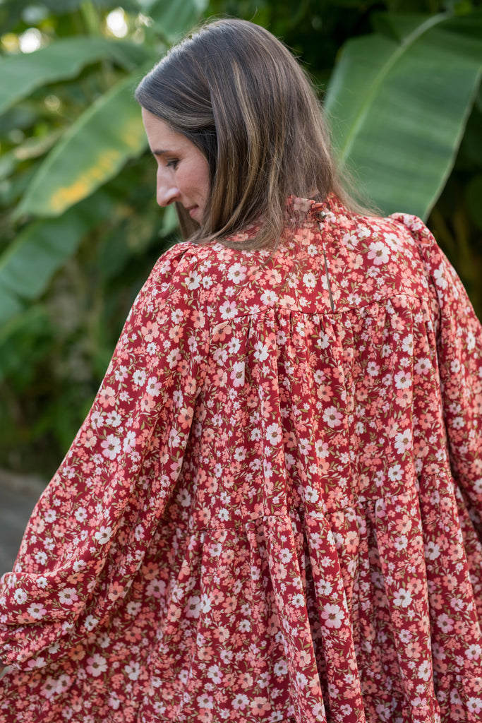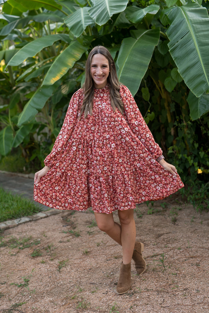 Introducing The Courtney—Twirl into autumn in this charming burgundy floral dress! Delicate blooms dance across the fabric while frilled neckline and bubble sleeves add a touch of whimsy. The tiered silhouette creates flattering movement, hitting just at the knee for the perfect balance of sweet and sophisticated. Secure button clasp on back keeps everything in place while you play. A wardrobe essential that brings joy to every occasion.